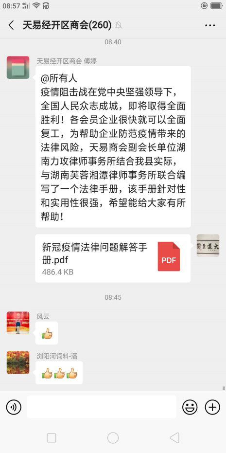 在湘潭,湖南芙蓉(湘潭)律师事务所紧急联合天易商会副会长单位湖南力攻律师事务所成立“疫情应急法律专业委员会”,针对湘潭县总商会,天易经开区商会反馈的关于防控疫情期间,企业复工、劳动关系、企业经营等多方面存在法律问题编写《新冠疫情下的法律问题解答手册》,为企业提供法律支持。